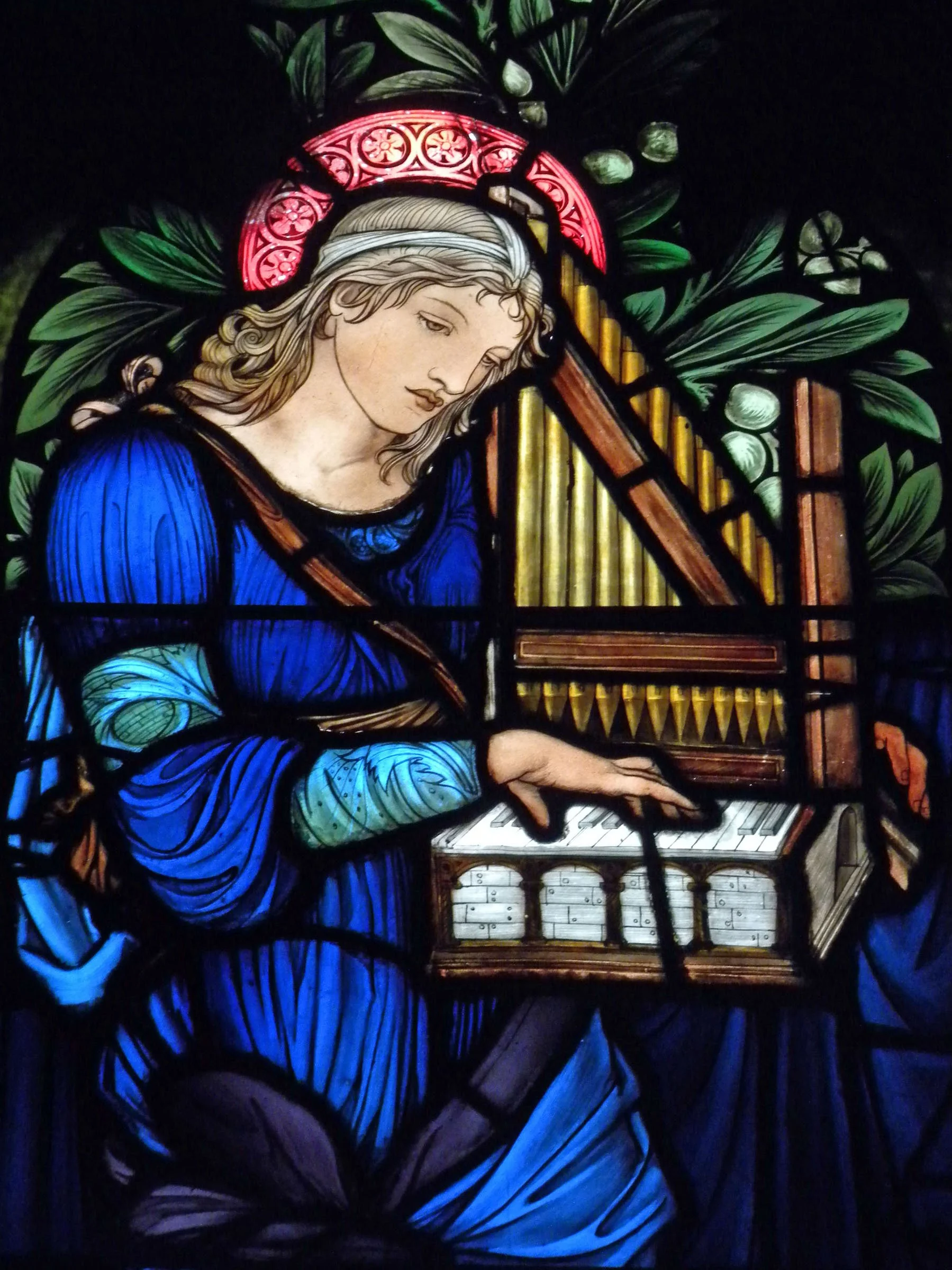 Upper portion of the St. Cecilia window at Second Presbyterian Church, 1936 S. Michigan Avenue in Chicago. The window was designed by Sir Edward Burne-Jones for Morris & Co., and over two dozen copies were produced in the last quarter of the nineteenth century, with each commission being customized in terms of color and decoration. Windows designed by Burne-Jones are known for their vivid colors and exquisitely painted details.