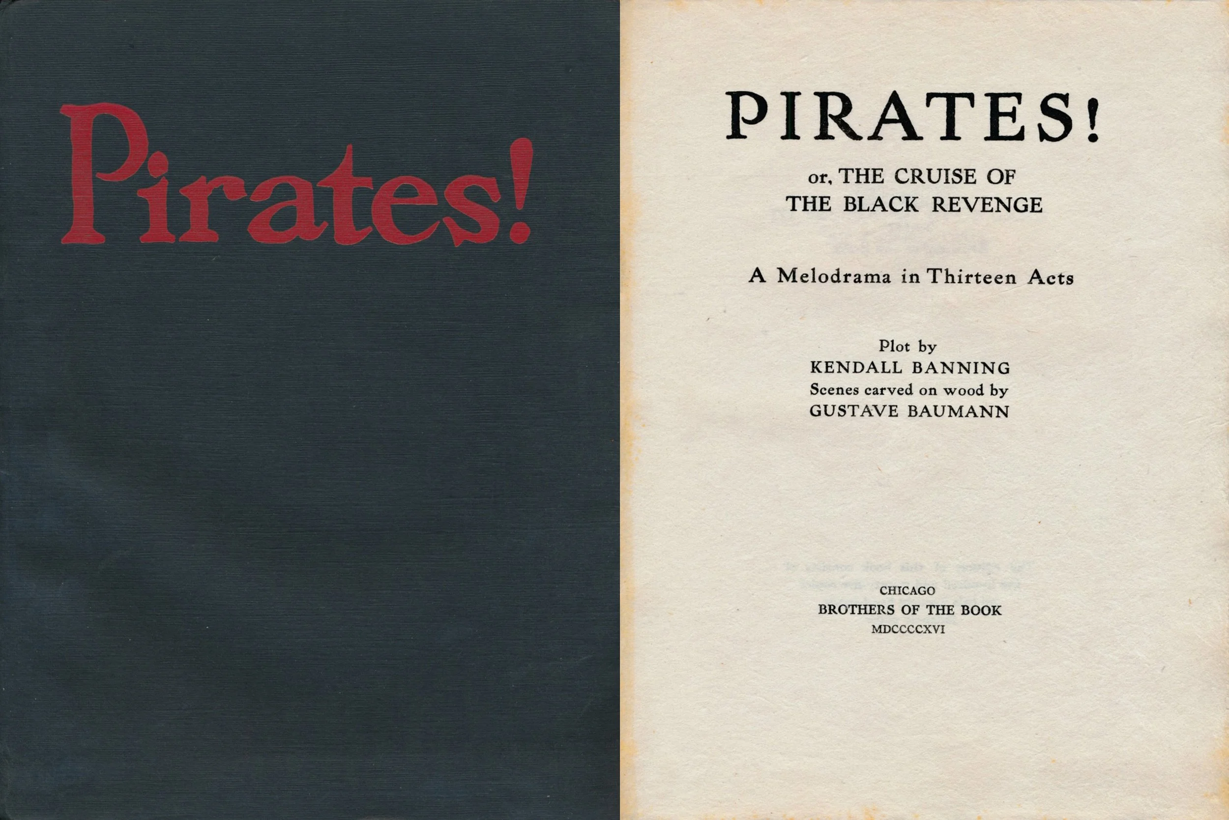 Pirates! or, The Cruise of the Black Revenge – A Melodrama in Thirteen Acts, appears to have been the most successful of all of the Brothers of the Book volumes, with an initial print run of 525 copies. Published in 1916, the work is printed on Kozuchi hand-made Japanese paper. It was designed in a 4to (quarto) format, which uses a large sheet of paper that is folded twice after printing to create four leaves (eight pages). As the book features beautiful letterpress printing, each page is only printed on one side, to avoid the ink bleeding through. The pages from each large sheet were left uncut along the top, so that the blank pages would be skipped as the pages were turned by the reader. The book was produced by the Faithorn Company where Woodworth was employed, located at 504 Sherman Street in Chicago (Sherman later became South Financial Place). A second edition, in a smaller format, was printed in 1918.